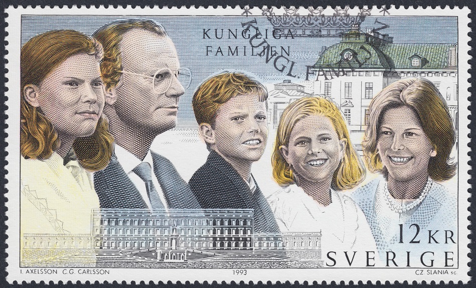 El sello más grande en tamaño en el que aparece Silvia, y con ella toda la familia real, es esta emisión de 1993, uno de los valores de la serie magnífica de cuatro piezas impresa en una hojita filatélica para conmemorar el XX Aniversario del reinado de Carlos XVI Gustavo. Aquí debajo añadimos, encima del sello emitido, una prueba de impresión de una de las planchas utilizadas para esta calcografía desprendida y ostentosa. Una talla espléndida de Slania, que colma con su técnica óptima y su estilo impávido un diseño excepcional.