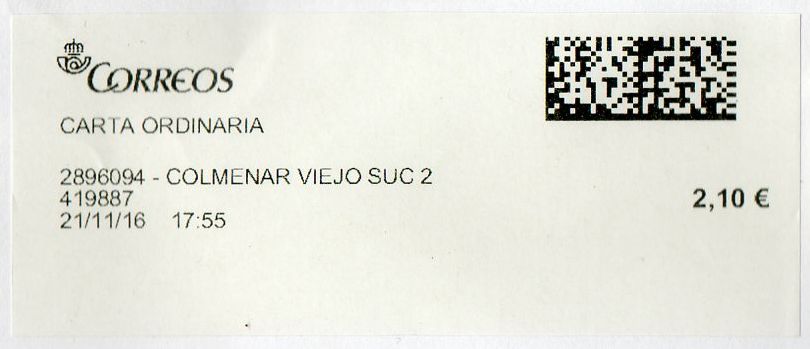 2896094-COLMENAR VIEJO SUC 2 / CARTA ORDINARIA / 21-11-16