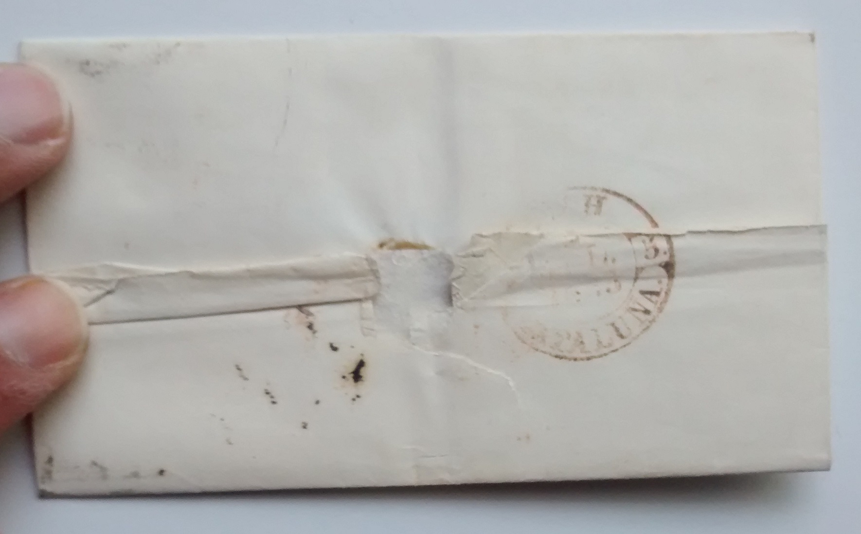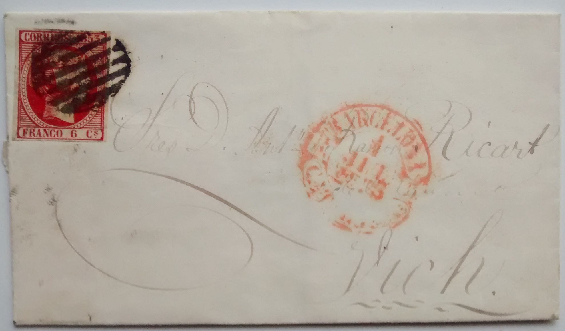 Sobreescrito 1853 de Barcelona a Vich. Baeza de Barcelona y Baeza de Vich al dorso. Parrilla cancelando sello de 6 cuartos de 1853