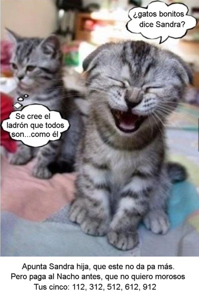 ign.sierra escribió:Sandra, mi sufridora compañera de curro quiere 5 numeros , si y solo si se los eligen unos gatos bonitos.