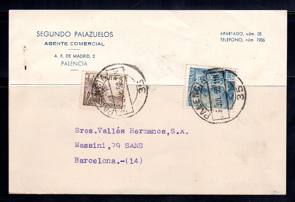 Sobre franqueado con sellos 30 cts. Franco y 5 c. Cid. Palencia julio 52
