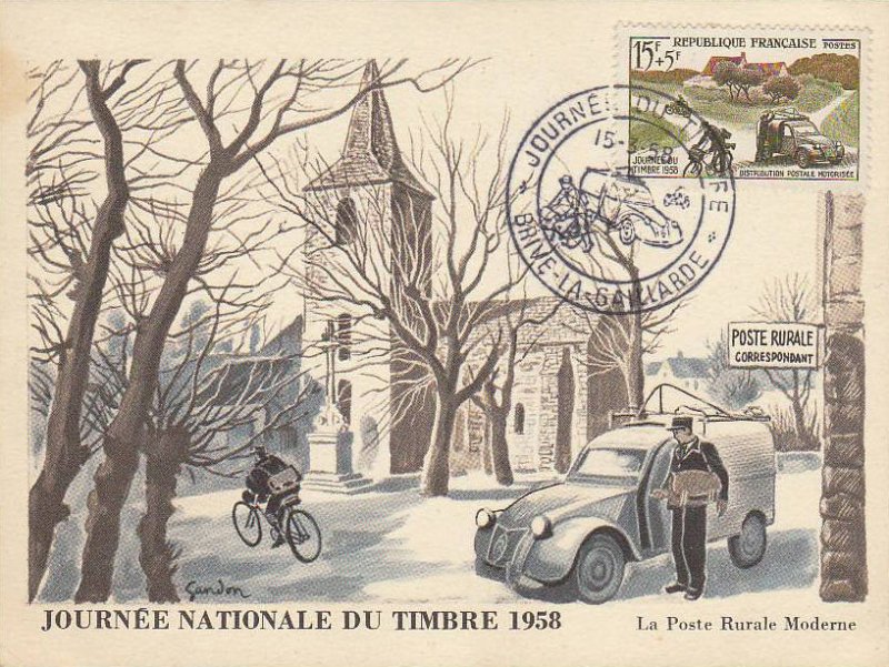 Por último, debajo de este comentario, la concesión filatélica de Gandon para celebrar el Día del Sello de 1958 en Francia. ¡Qué ofrenda tan deliciosa! Dádiva calcográfica que acompañamos, además, con dos tarjetas de Primer Día: una con la acuarela del mismo Gandon dibujada a propósito para esta emisión, y otra que no podemos dejar de mostrar, dado el encanto irresistible y romántico que tiene esa escena fotografiada, que podemos imaginar a las puertas de cualquier estafeta postal del mundo.