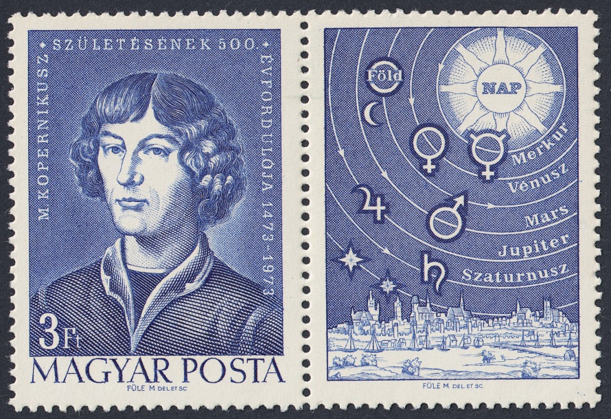 Por debajo de estas palabras, agregamos, en primer lugar, el sello emitido por Hungría en 1973 de Copérnico: diseñado y grabado por Mihaly Füle. ¡Qué sello! Grande, consistente, muy sobrio y artístico. Uno de los mejores sellos dedicados a Copérnico.