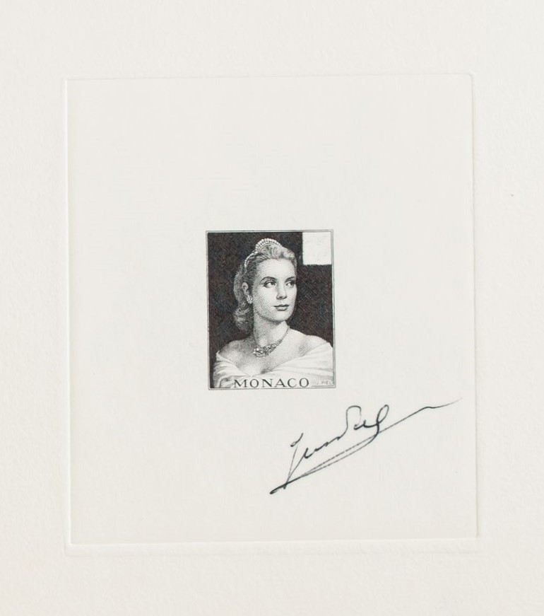 Abrimos este apéndice forzoso de Grace Kelly, para ir completando sus mejores momentos filatélicos. Sobre estas líneas, una prueba de artista finalmente descartada, ¡de Jules Piel! Por la fecha de esta muestra, año 1957, tal vez fue desestimado en beneficio del sello finalmente emitido a principios de mayo, que fue nada menos que el perfil de la Princesa a cargo de Pierre Gandon (1). ¡Qué difícil estuvo la decisión, si así fue! Extraña, en cualquier caso, y dada la opulencia postal de Mónaco, que esta maravilla de Piel no cuajase finalmente en un sello. Una frustración más que añadir a la espalda negra filatélica de Jules Piel: recordemos que suyo fue el proyecto no aprobado de Descartes para la emisión francesa de 1937 (2), que recayó en las manos y el ingenio de Henry Cheffer.