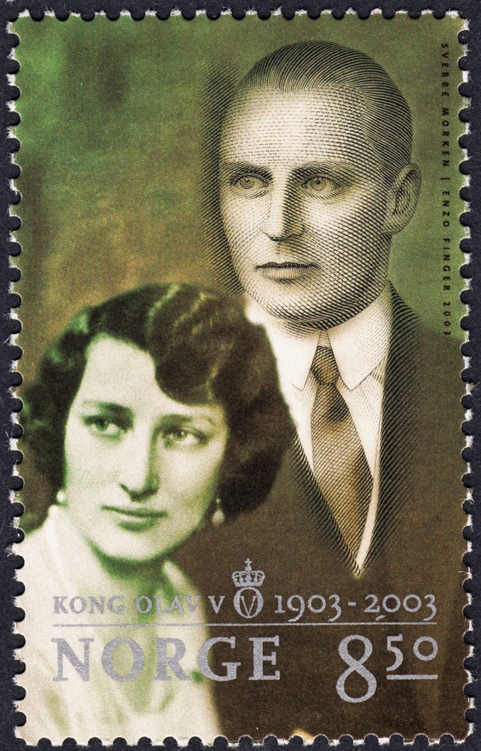 En esta emisión de Noruega del año 2003, dedicada al centenario del nacimiento del Olav V, que reinó en el país nórdico entre 1957 y 1991, el diseñador de los sellos, Enzo Finger, colabora con el grabador y por entonces ya jefe de del departamento artístico del Banco Central de Noruega, Sverre Morken. La derivación filatélica es una emisión postal, impresa mediante calcografía y offset, en la que el progreso tecnológico no hostiga el libre albedrío artístico, que siempre, sin excepciones, ha de encauzar y delimitar. La técnica, pues, sólo espolea y vigoriza, en tanto que la conciencia artística decide y ejecuta. ¡Exquisitos sellos!