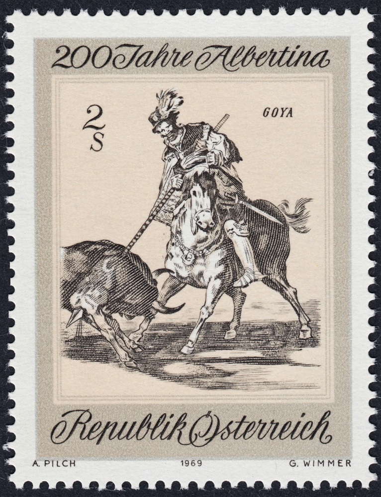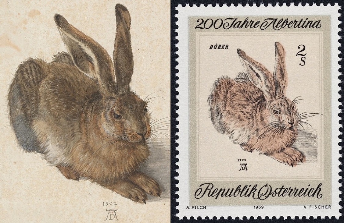 Después de mostrar dos de los ocho sellos de esta serie de Austria de 1969, parece un buen momento para exponer los seis restantes. La serie, con diseño general de Adalbert Pilch e impresa en calcografía y huecograbado, celebra el bicentenario del Museo Albertina de Viena. Por esta razón, se recrea una selección formada por ocho aguafuertes y dibujos de grandes artistas, que están o estaban entonces en ese Museo, a cargo de algunos de los mejores grabadores austríacos del momento, entre ellos Rudolf Toth y Alfred Nefe, con dos sellos cada uno, o Georg Wimmer, que talla una de sus últimas obras. Dejamos para la entrada siguiente los grabados de Toth y de Alfred Fischer.
