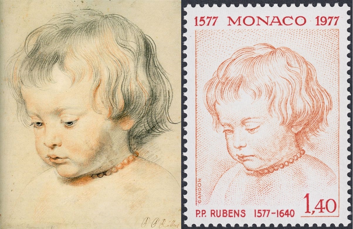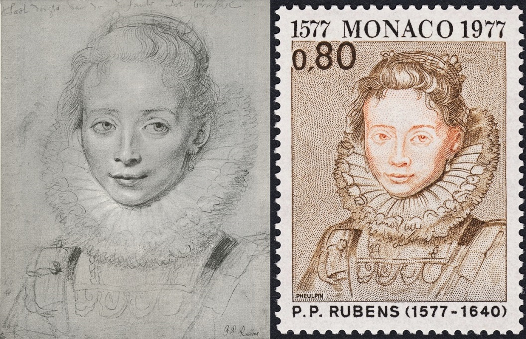 Rectifico esta entrada, encontrados ya por fin los sellos para presentarlos como merecen. Gandon, decíamos, también grabó el dibujo de este hijo de Rubens, Nicolas, al que, con el fin de no dificultar una búsqueda posterior, dejamos con su nombre en francés. Este es uno de los tres sellos de la emisión calcográfica de Mónaco de 1977, con ocasión del cuarto centenario del nacimiento del gran artista flamenco. Los dos sellos restantes, que añadimos al final, los grabó Jean Pheulpin: Retrato de una joven y un dibujo de George Villiers, primer Duque de Buckingham, al que retrató el propio Rubens en un gran óleo. Dos tallas muy intensas de Pheulpin, concentradas y convincentes, propias de este grabador siempre presto y expeditivo.