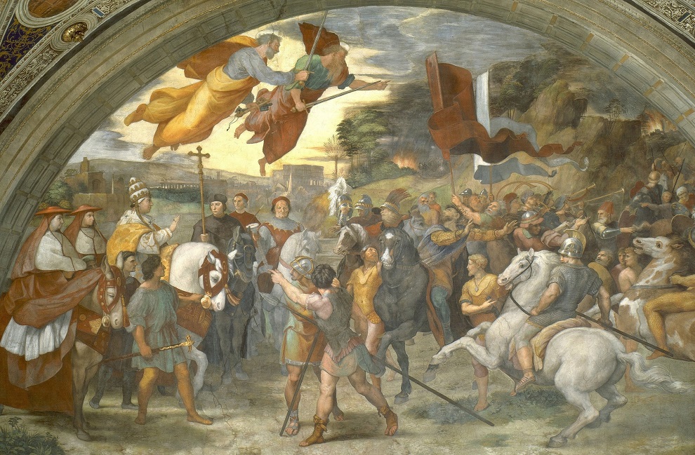 El sello que graba Cionini, que glosamos en esta entrada, se inspira en uno de los frescos de Rafael situado en los Museos Vaticanos y titulado Encuentro de León Magno con Atila. La obra es una bella puesta en escena del triunfo de la Iglesia, representada por el Papa León I, sobre los bárbaros, simbolizados por Atila, que montado en su caballo parece sorprendido por las espadas de san Pedro y san Pablo, que dominan la composición desde lo alto.