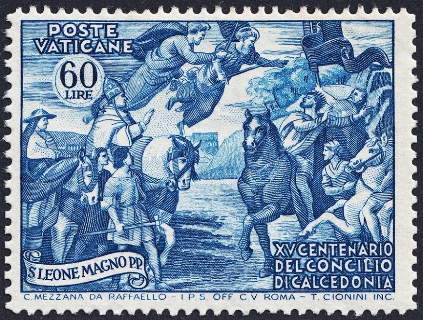 Distribuimos en dos entradas esta serie de dos sellos y cinco valores, emitida por el Vaticano en 1951 y dedicada al Concilio de Calcedonia celebrado mil quinientos años antes. De los grabados de los sellos se ocupan Mario Colombati y Trento Cionini, con diseño de Corrado Mezzana (1890-1952).