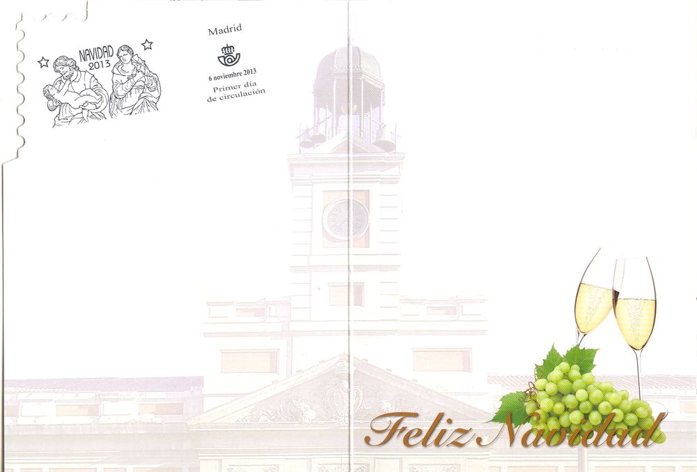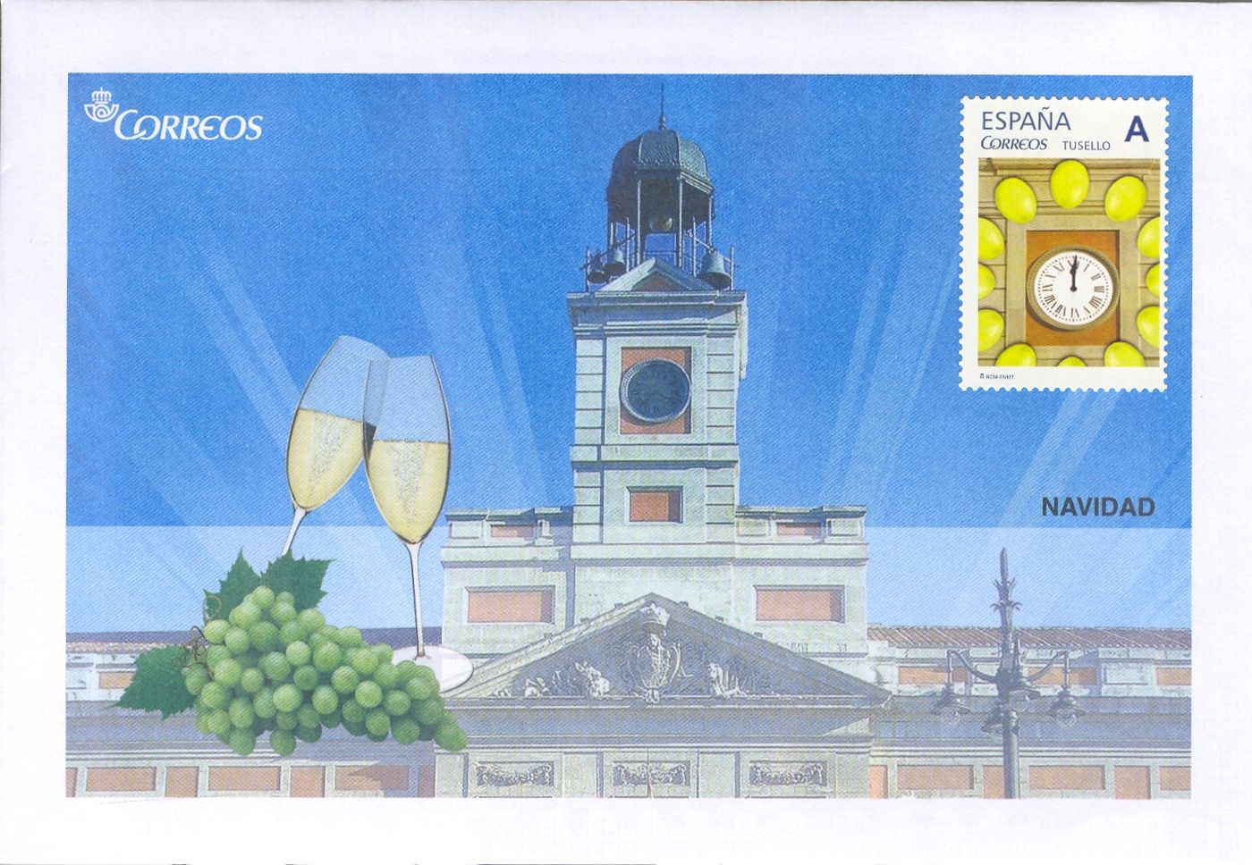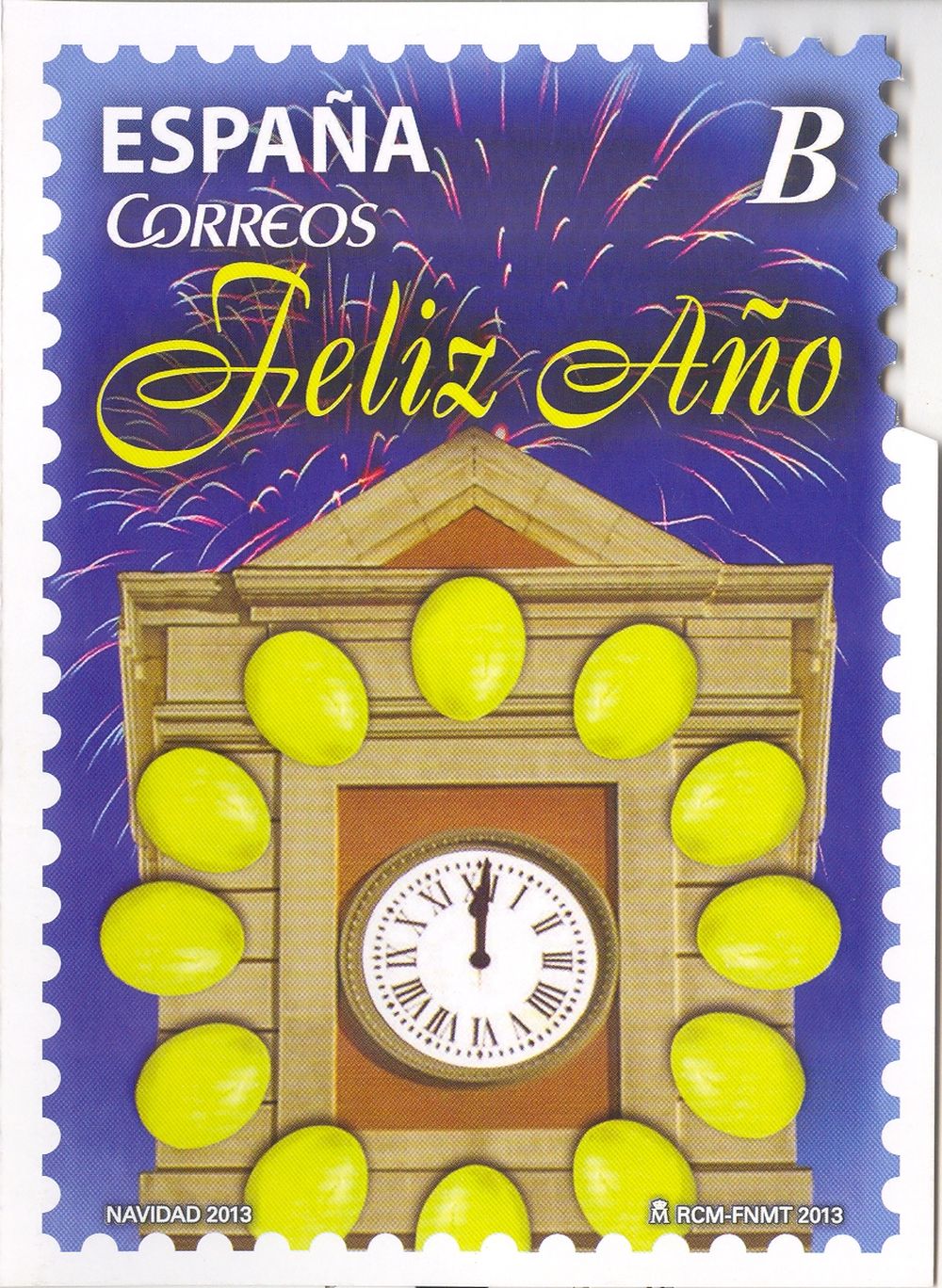 ¡Feliz Año! es el mensaje lanzado en este sello, que aparece ilustrado con el reloj de la Puerta del Sol de Madrid y las doce uvas.