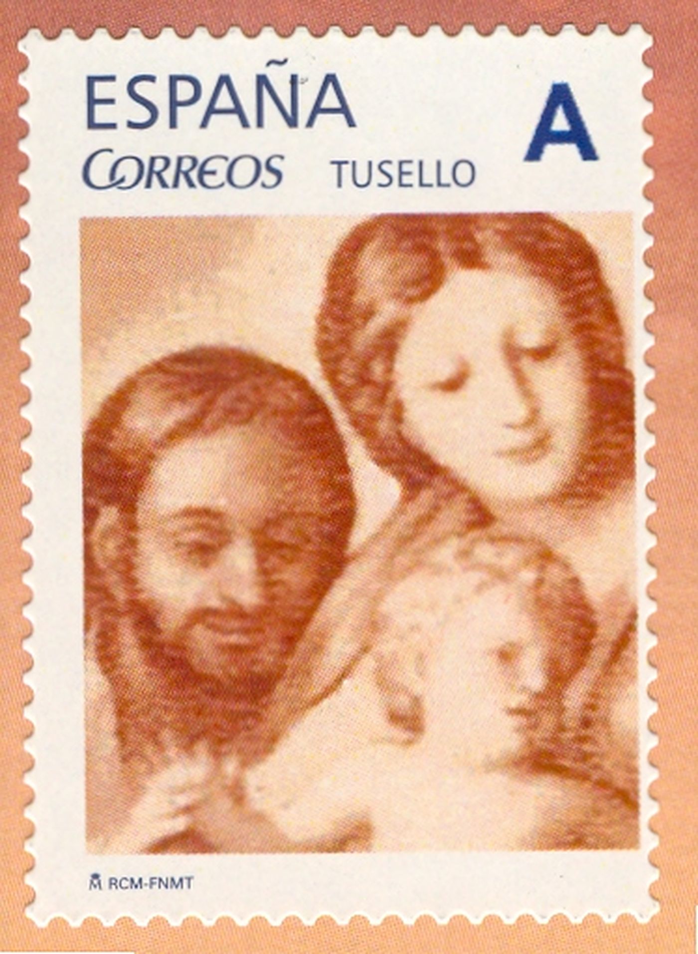 El sello muestra a La Sagrada Familia, en una pintura de estilo rococó realizada por el pintor aragonés Francisco de Goya para la decoración de la Basílica del Pilar, que entonces estaba a punto de ser concluida. Fue adquirida para el Museo del Prado en 1877, por órdenes del rey Alfonso XII, quien pagó en aquel entonces un precio de 2.000 pesetas a los herederos de Manuel Chávez, a quien Goya la vendió tras ser rechazada para decorar a la Basílica del Pilar.