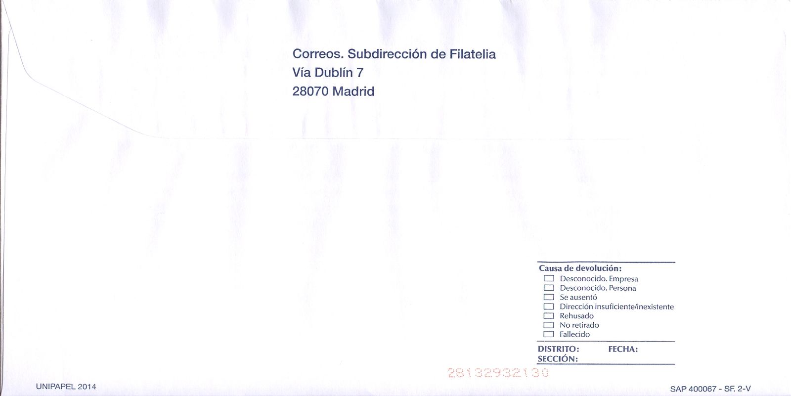 Y la publicidad comentada en el primer mensaje, se envió en sobres del Servicio Filatélico, con referencia SAP 400067 - SF-2-V, fabricados por la empresa UNIPAPEL en el año 2014, con remitetne de la Subdirección de Filatelia.