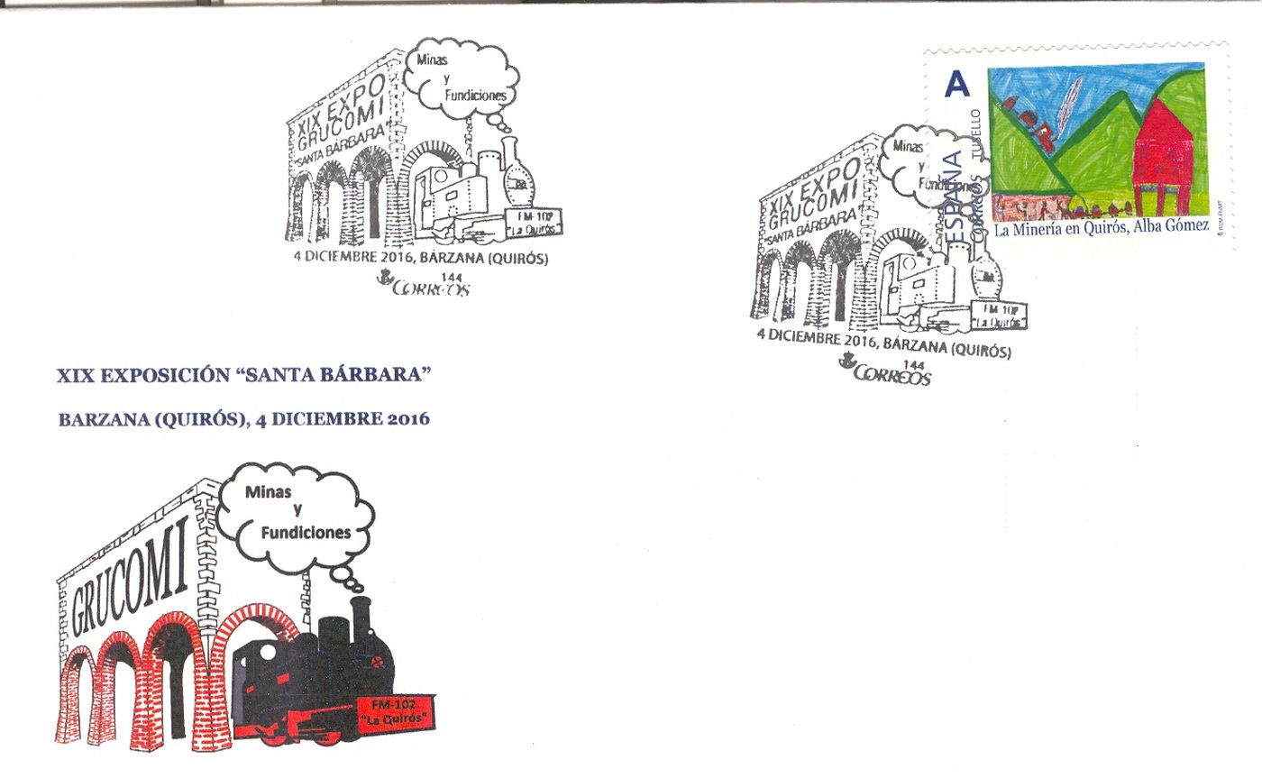 Con ocasión de la celebración, en Bárzana, Quirós, del 3 al 11 de diciembre del año 2016 de la "XIX Exposición de Coleccionismo Minero de GRUCOMI. SANTA BÁRBARA 2016. LA MINERÍA EN QUIRÓS", el Grupo Coleccionista Minero Investigador (GRUCOMI), de Oviedo, ha emitido un sello personalizado que ha sido diseñado por Alba Gómez.