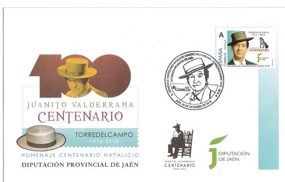 El próximo día 21 de diciembre Diputación Provincial de Jaén emitirá un material filatélico compuesto por sello personalizado, sobre y matasellos conmemorativo con motivo del centenario del nacimiento de Juanito Valderrama.