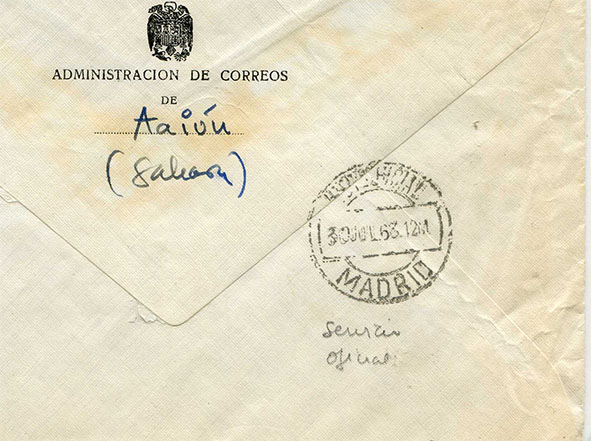 y Servicio Oficial Madrid (creo, no estoy muy seguro ... ¿Estafeta Oficial, quizás?). Circular de 30 mm. de 30 JUL 63. Está como llegada.