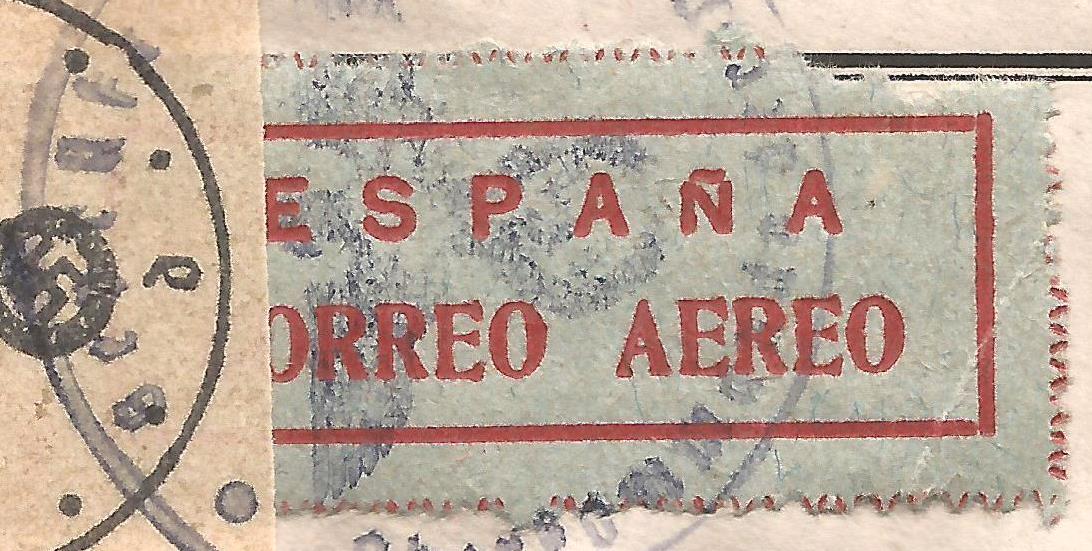 La etiqueta catalogada como CORREO AÉREO nº 3 utilizada el 25 noviembre 1943 de Valencia a Spa (Bélgica), remite Laboratorios Dr. Trigo (Orangina y Tri Naranjus)