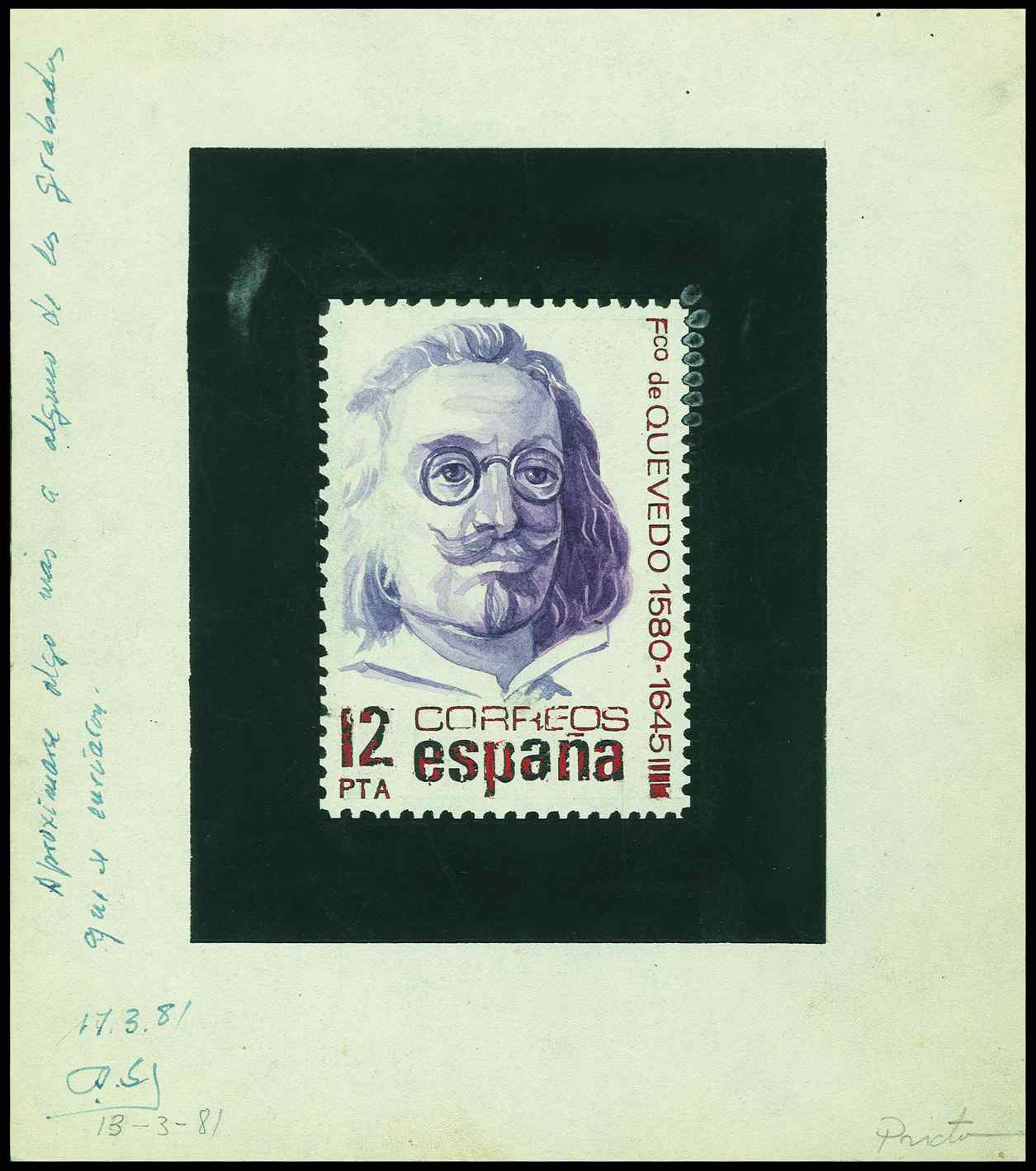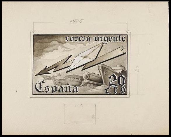 Del proyecto mostrado del sello del Correo urgente, de 1942, tengo dos imágenes complementarias: un dibujo a lápiz, previo a ese boceto expuesto, y ya una prueba de punzón firmada por el grabador, José Luis López Sánchez Toda.