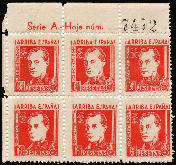 Salsamendi en otro hilo, plantea la autenticidad de esta viñeta de Falange, con la imagen de Jose Antonio y valor de 6 ptas, dejo ese bloque de 6 por si puede ayudar al ser borde superior de pliego: