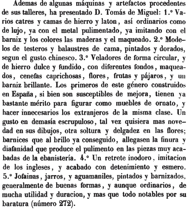 La Junta calificadora de la Exposición presenta un libro con la memoria de los productos expuestos. Ahí podemos ver la especialización del herrero Tomás Miguel: