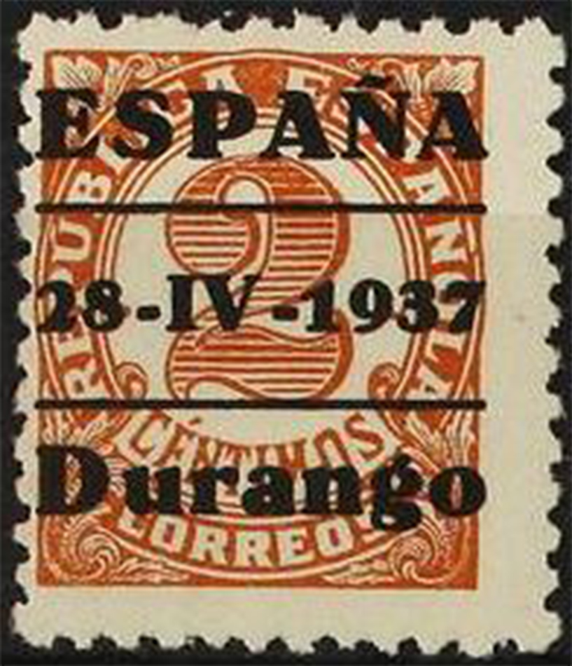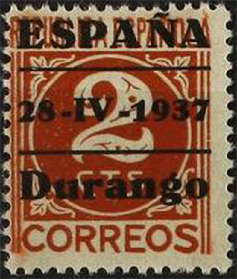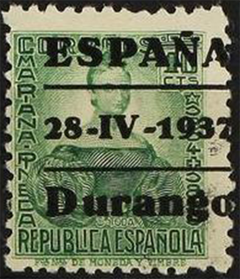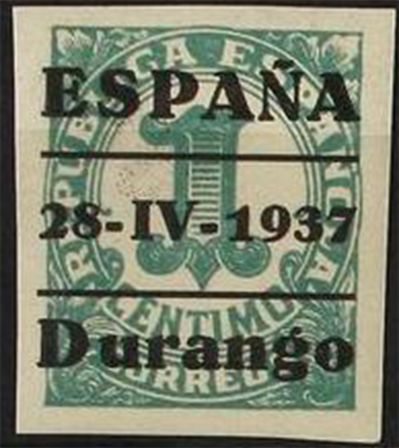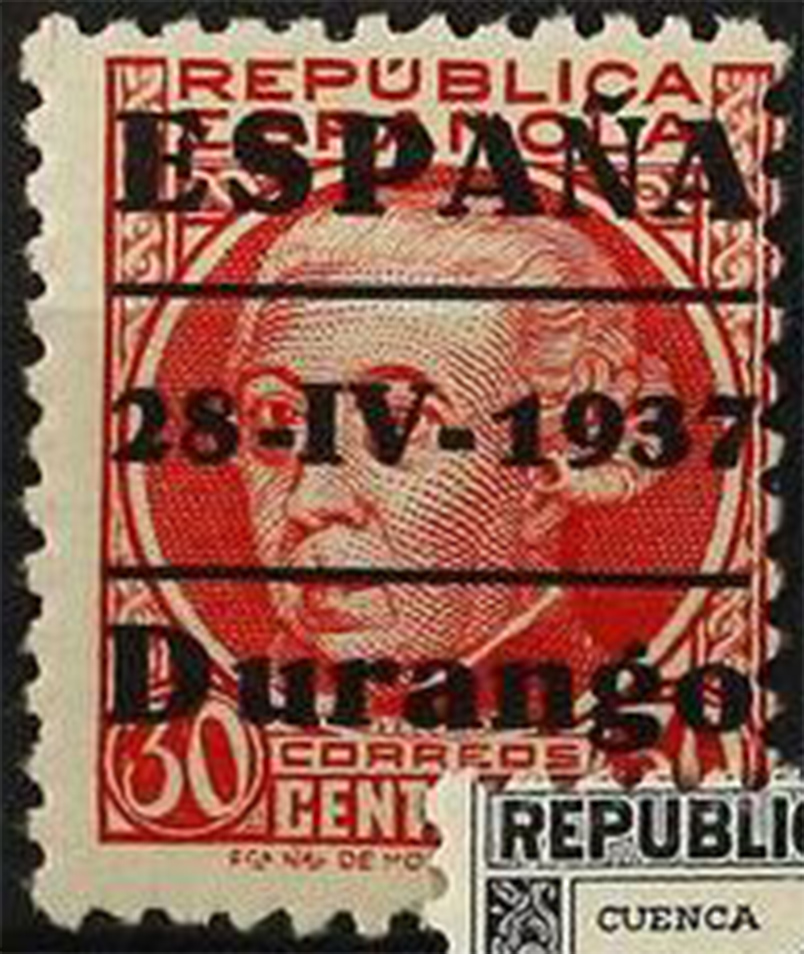 Adjunto sellos sobrecargados de Durango, con fecha 28 de abril de 1937, Durango había sido bombardeado por los aviones Savoia Italianos el 31 de marzo de 1937.