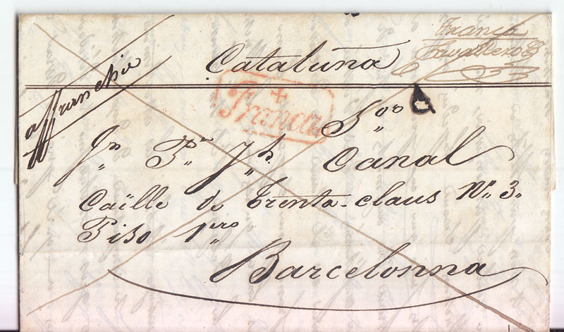 Esta es acojonante ya que se mandó a La Coruña sin pasar por Francia. Por eso se tachó el 6 cuartos y se añadió la marca de 10 reales.