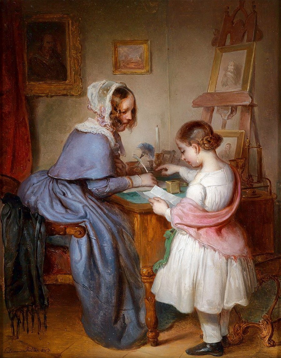 En cada uno de estos dos óleos, obras pulcras y afectuosas del artista inglés Francis Bernard Dicksee (La madre) y del austríaco Eduard von Ritter (La carta), una madre y su hija aúnan emociones con una cartita de por medio.