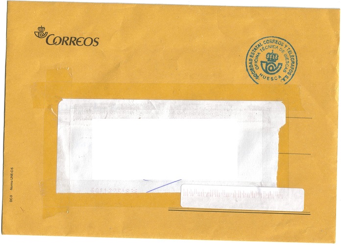 Aporto sobre de carta de Correos.- OF TEC de Biescas.- Huesca. para el catalogo , desconozco si ha sido ya aportada.