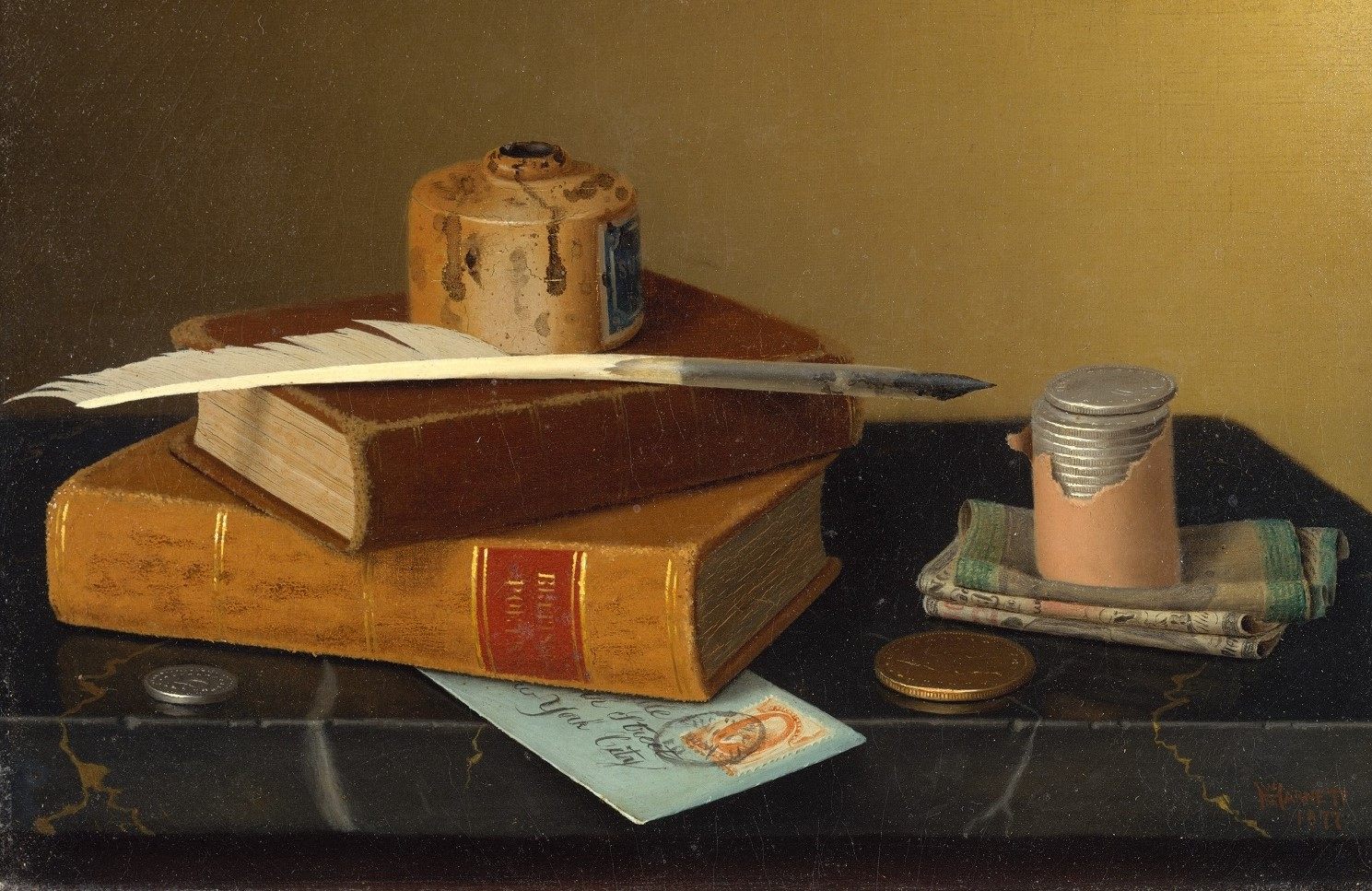 "The Banker's Table" (1877), de William Michael Harnett. Óleo sobre lienzo, 20.3 x 30.5 cm