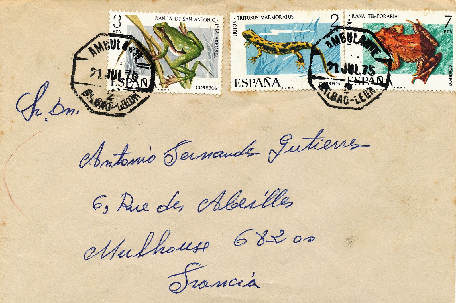 Bonito franqueo para llegar a las 12 pesetas, según la tarifa al extranjero que entró en vigor el 01/12/1974.