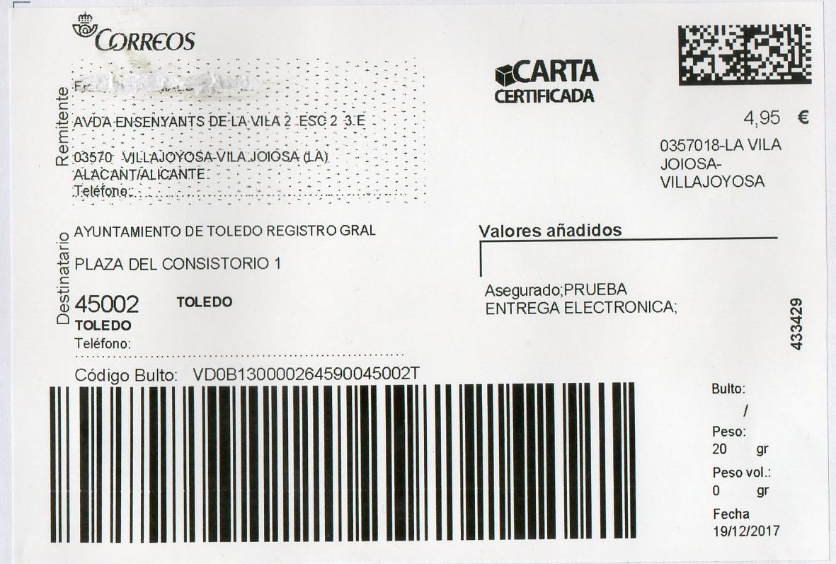 0357018-LA VILAJOIOSA-VILLAJOLLOSA / CARTA CERTIFICADA / 19-12-17