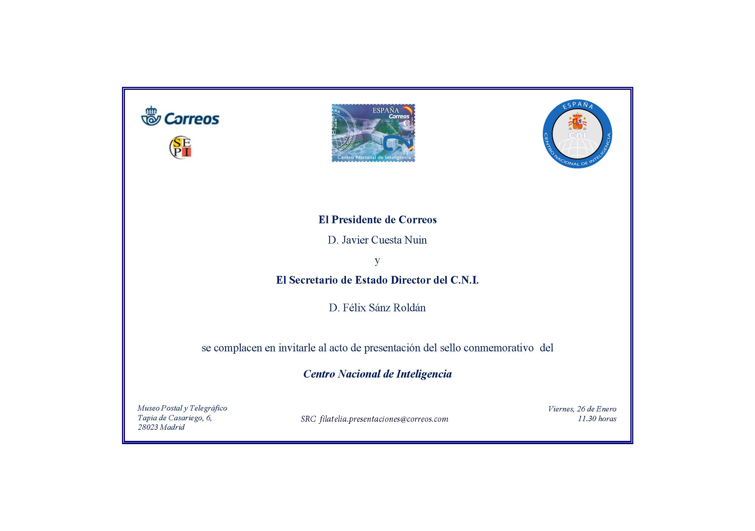 Reproduzco la invitación que, en este sentido, han cursado el Presidente de Correos, Javier Cuesta Nuin; y el Secretario de Estado Director del C.N.I., Félix Sánz Roldán.
