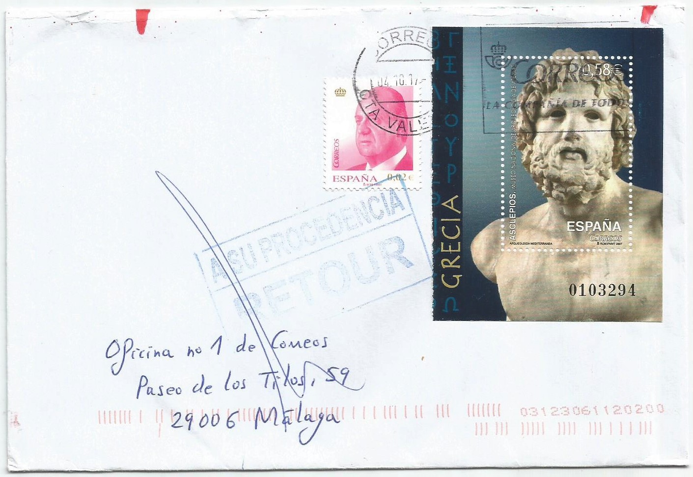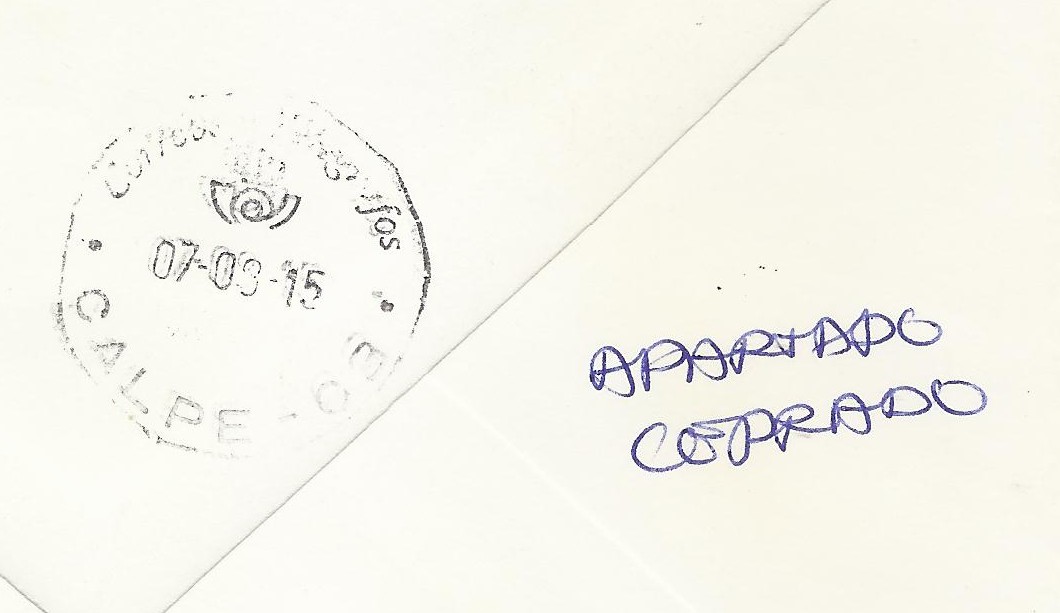 Otro caso y otra marca en este caso "DEVUELTO-RETUR" y la causa "apartado cerrado". Además existe un error en uno de los fechadores, bien sea en el de salida Algemesí (3/09/2015) o de llegada Calpe (7/08/2015), porque no puede ser :roll: .