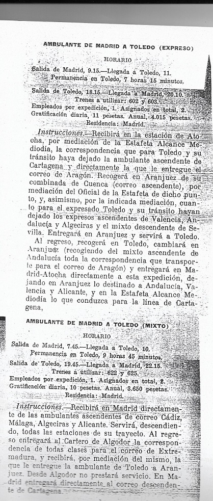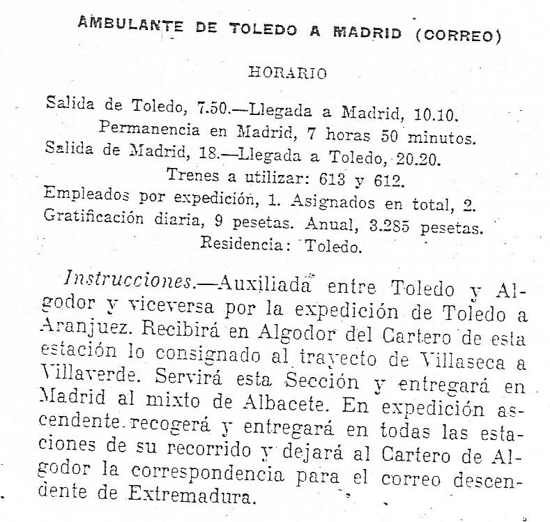 Subo estos horarios del ambulante de Madrid a Toledo,son del año 1926 por lo cual el recorrido pudo sufrir modificaciones a lo largo de los años.