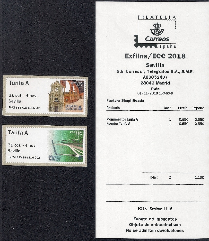 El siguiente, también modelo "Monumentos", de la máquina inglesa ES01 y matasello de la EXFILNA. Y como ya sabemos.... la tinta tarda muy muy mucho en secarse...