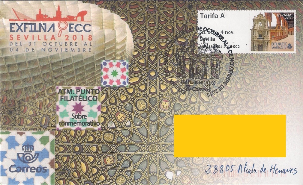 Empiezo con un sobre preciosamente decorado con el ATM modelo "Monumentos" de la máquina de sobremesa EX18 y matasello especial del ATM PUNTO FILATÉLICO.