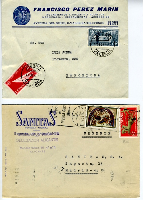 a) Carta del 14.FEB.57 de Valencia a Barcelona. Sello de 2 ptas para pagar el derecho de urgencia, usado conforme a las instrucciones y al tarifa de actualidad entonces.
