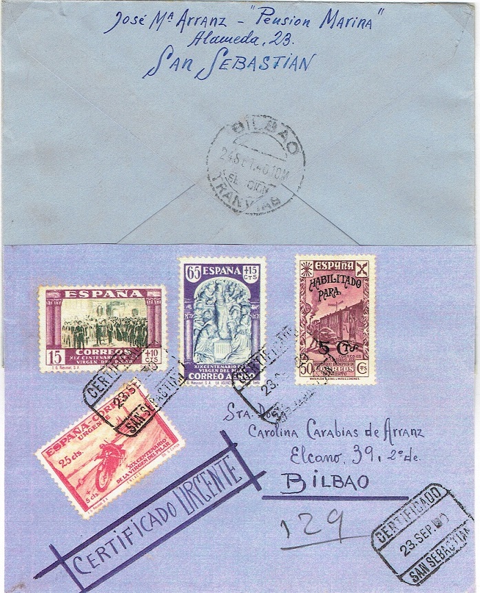 -"Carta certificada "Urgente" de San Sebastián a Bilbao en 1940. Franqueo de 40+40+25c en sellos "Pilar" + sobretasa y sello benéfico de 5c, con matasellos CERTIFICADO/SAN SEBASTIAN 23 SEP 40. Al dorso, fechador de llegada, BILBAO-SECCION-TRANVIAS 24 SET 40. 10 M."-