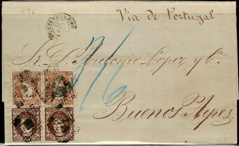 Siguiendo con este tema aqui presento un franqueo para Argentina compuesto por sellos de esta emisión tanto en milésimas como en cuartos. La carta es un doble porte de España a Argentina vía Portugal, tarifa 1 de agosto de 1867 a la cual, si no me equivoco, le faltan 10 milesimas pra completar el franqueo correcto de 700 milésimas el doble porte.