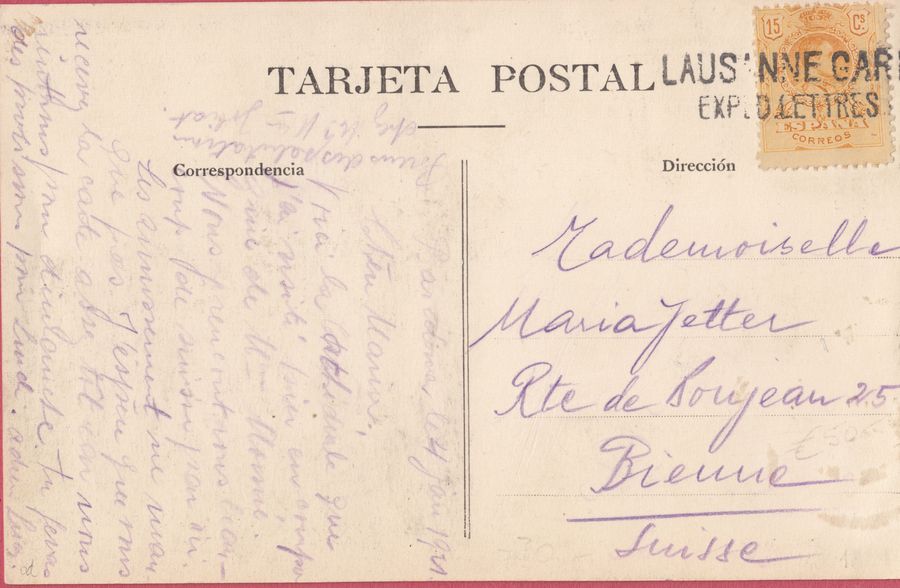 Matasellos fechador de Mérida, poco legible, el "5c" pisa uno de los sellos y completa el ESPAGNE 4 ST.JEAN DE LUZ 4, 9 abril, en color azul.