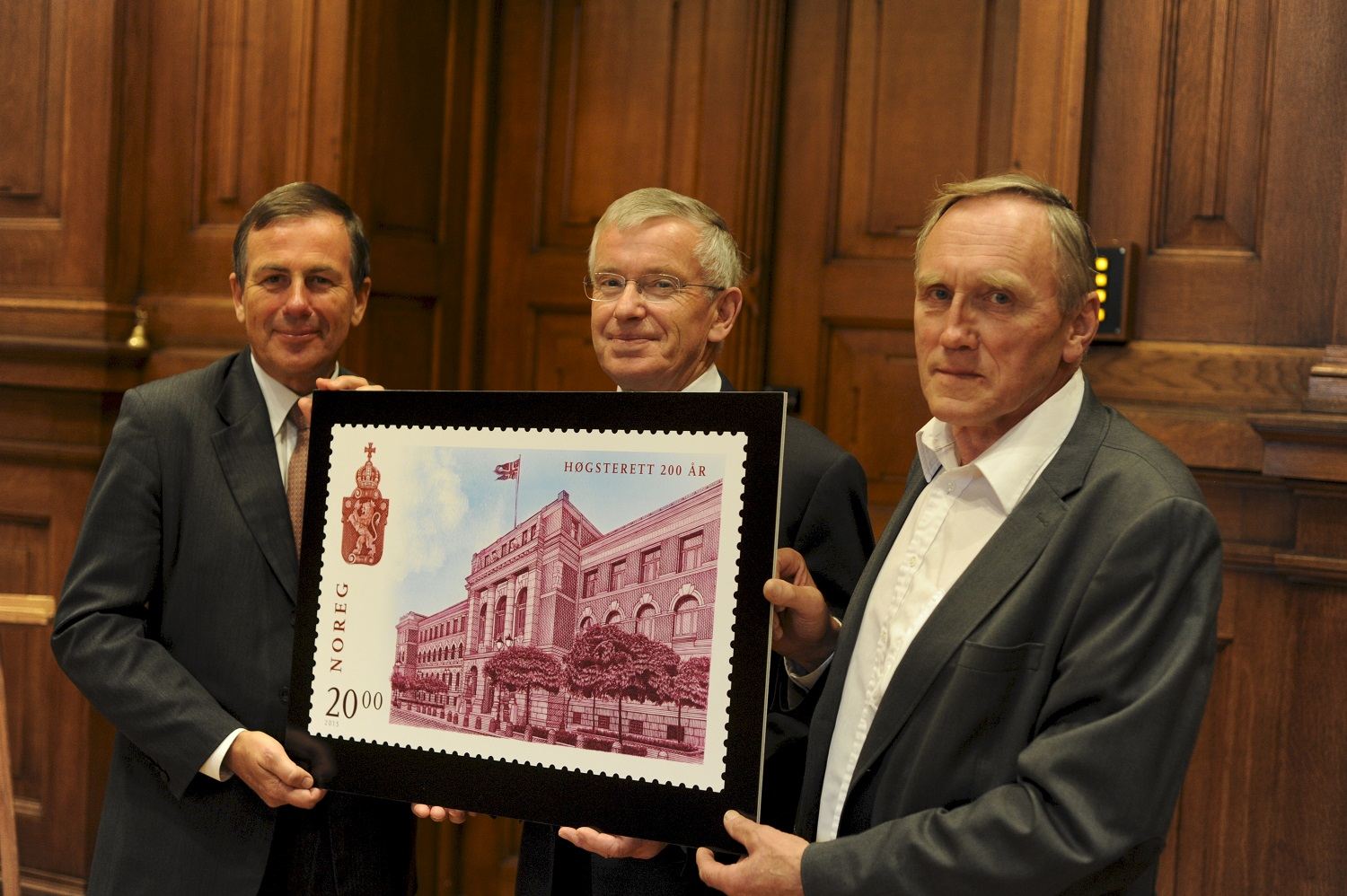 Sobre estas líneas, fotografía de la presentación oficial de este sello que conmemoró en 2015 el bicentenario de la Corte Suprema de Noruega. Morken es el primero por la derecha.