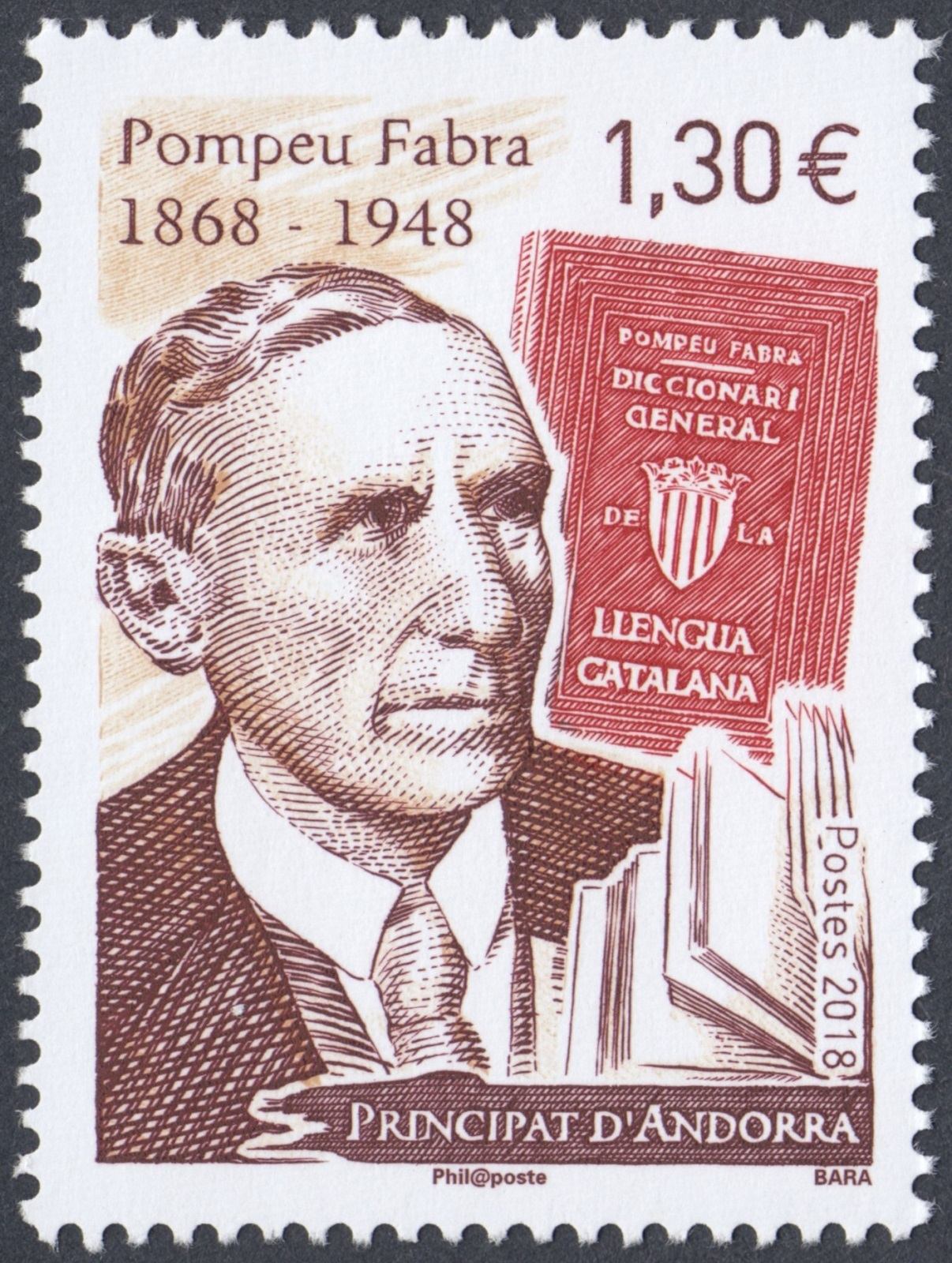 Andorra, 2018, Pompeu Fabra. Sello diseñado y grabado por Pierre Bara. Calcografía
