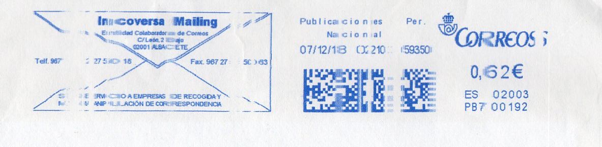 Y lo del torcido, pues no sé, porque normalmente, cuando se imprime sobre etiquetas estas son pegadas posteriormente al envío, pero en este caso se ve la palabra Publicorreo sobre la funda de plástico. Puede que hayan movido la funda una vez impresa, o haber impreso la funda antes de meter el contenido ¿¿¿??? ni idea. Podría explicar el desplazamiento que al imprimir la impronta los rodillos de la impresora han tirado de la funda y por eso se ha movido, al carecer de consistencia.