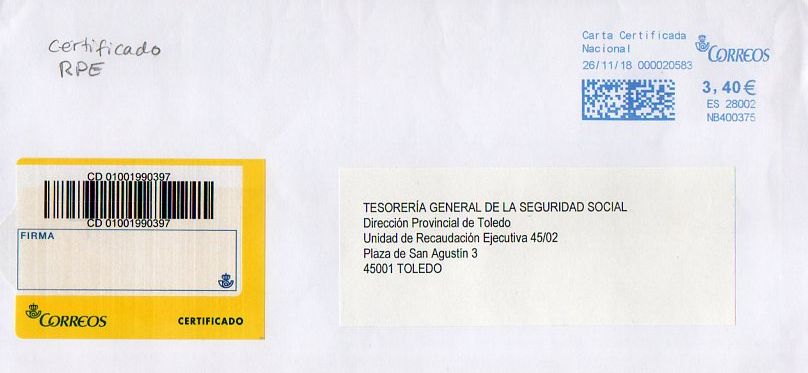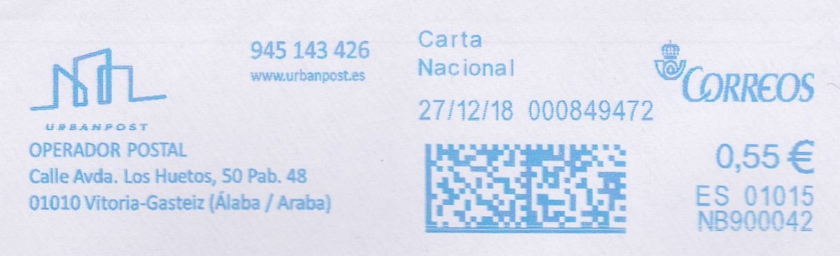 Unos mensajes atrás, veíamos un franqueo mecánico azul de esta misma empresa con un sobre del Ayuntamiento de Logroño.