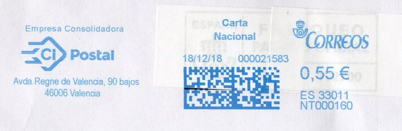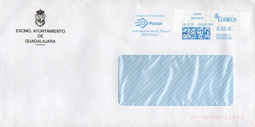 Curiosa impronta. La empresa Correo Inteligente Postal tiene su sede en Oviedo (Asturias) y de ahí el código postal 33011. Dispone de delegaciones en diversos lugares, entre ellos Valencia, de ahí la dirección que figura en la cartela. Lo más extraño es el membrete del Ayuntamiento de Guadalajara... :mrgreen: