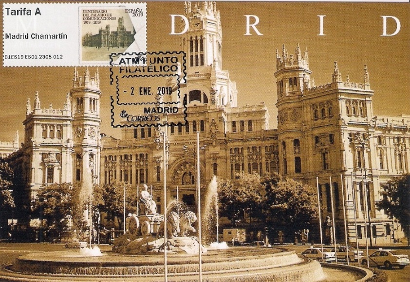 Modelo Palacio de Comunicaciones, como el anterior con el matasello ATM PUNTO FILATELICO de Chamartín y fecha del primer día de uso.