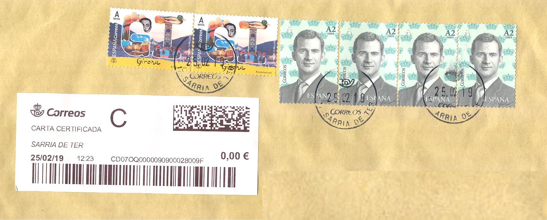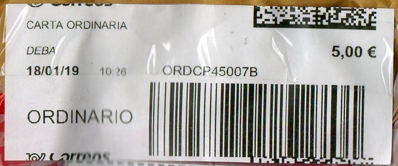 La etiqueta lleva franqueo 0,00 € ya que el envío iba prefranqueado.