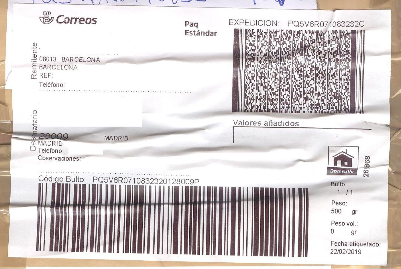 Etiqueta Grande. Nueva. Paq Estándar. No indica (Barcelona, sin precisar). 262868. Domicilio. Sin franqueo. 10x14,5. 2019-02-22. Baja.jpeg