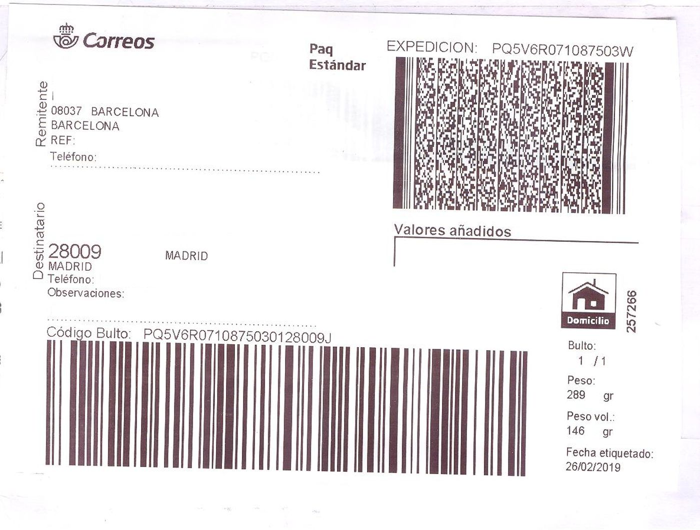 Etiqueta Grande. Nueva. Paq Estándar. No indica (Barcelona, sin precisar). 257266. Domicilio. Sin franqueo. 10x14,7. 2019-02-26. Baja.jpeg