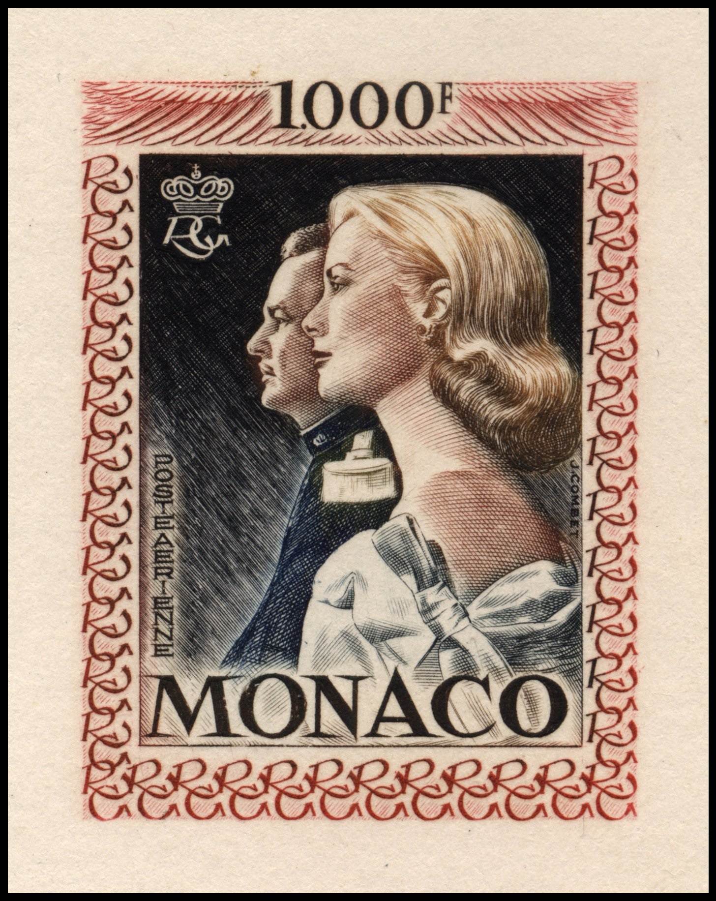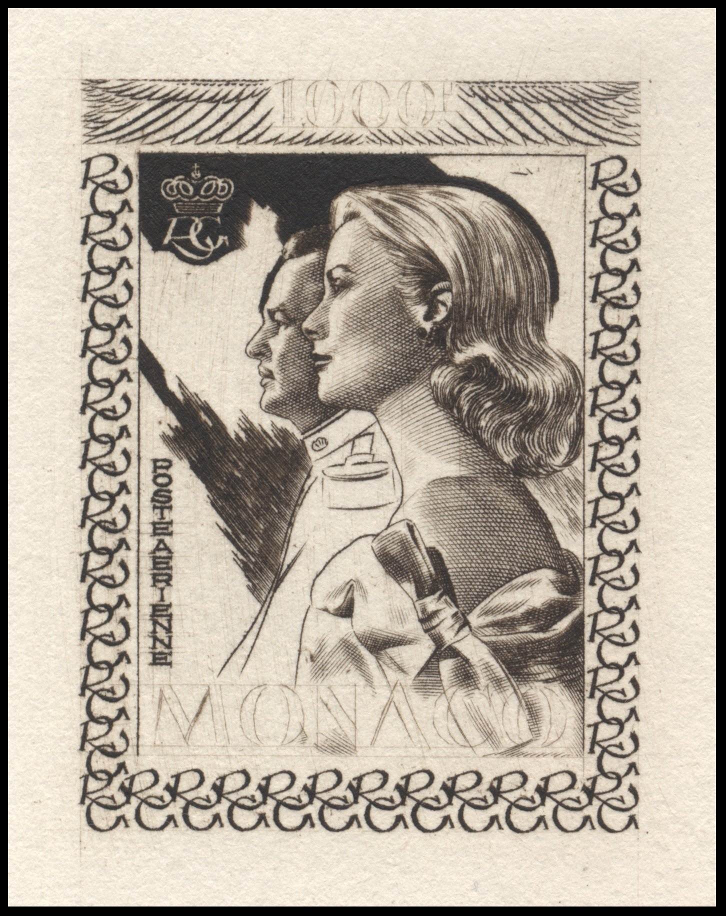 Mónaco, 1959, Correo Aéreo, Rainiero III y Grace Kelly. Sello finalmente emitido en dos valores calcográficos, diseñado y grabado en 1959 por Jules Piel