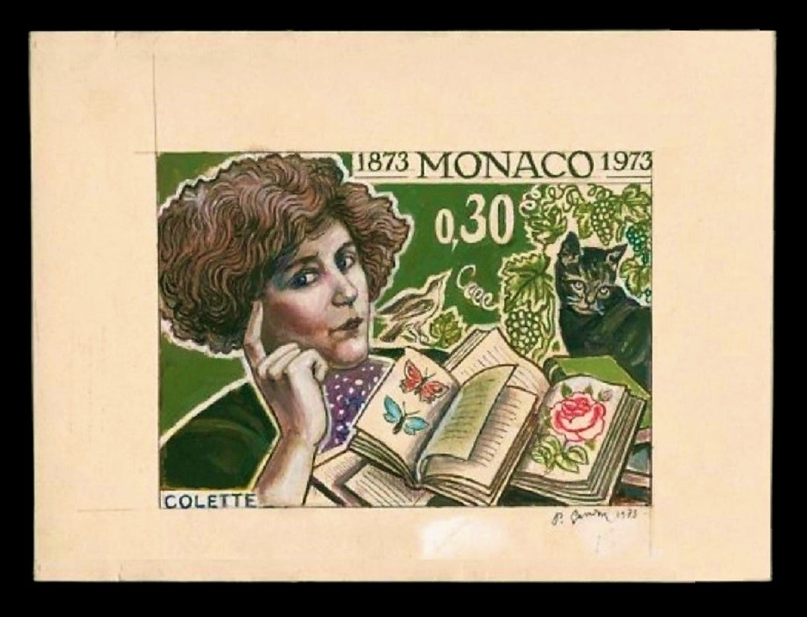 Mónaco, 1973, Sidonie-Gabrielle Colette. Diseño original adoptado y sello emitido, después del grabado a buril de Pierre Gandon. Calcografía